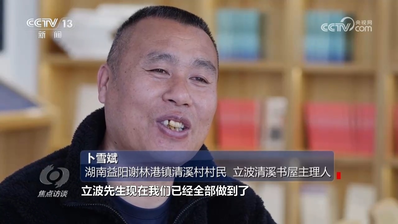 湖南益陽謝林港鎮(zhèn)清溪村村民、立波清溪書屋主理人卜雪斌:“這個時間我記得清清楚楚,村里是2022年3月16日,第一次到我家里來,宣傳書屋的構(gòu)想,3月19日做設計方案的就過來了,3月22日基本上就動工了?!?/p>