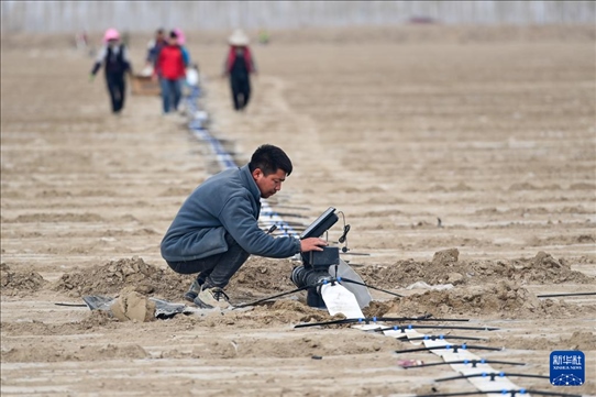 在新疆阿克蘇地區(qū)阿瓦提縣高標(biāo)準(zhǔn)農(nóng)田核心示范區(qū),農(nóng)業(yè)技術(shù)員在調(diào)試水肥一體化灌溉系統(tǒng)(3月27日攝)。