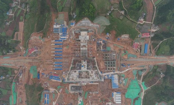 站房設(shè)計(jì)理念以“生態(tài)京山,觀鳥天堂”為主題,立面形成三層流暢的曲線造型,通過層層的推進(jìn),形成飛鳥展開的羽翼,打造舒展柔軟的建筑形象。設(shè)計(jì)提取京山“京”字筆畫,運(yùn)用抽象化建筑語言描摹“京”字之形,形成流暢的建筑形體。目前,車站樁基施工完畢,基礎(chǔ)承臺建設(shè)完成三分之二。