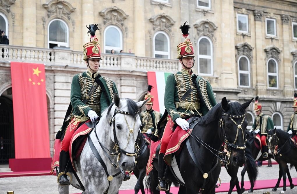當?shù)貢r間5月9日上午,國家主席習近平在布達佩斯出席匈牙利總統(tǒng)舒尤克和總理歐爾班共同舉行的隆重歡迎儀式。習近平在舒尤克陪同下檢閱國防軍儀仗隊和騎兵儀仗隊。