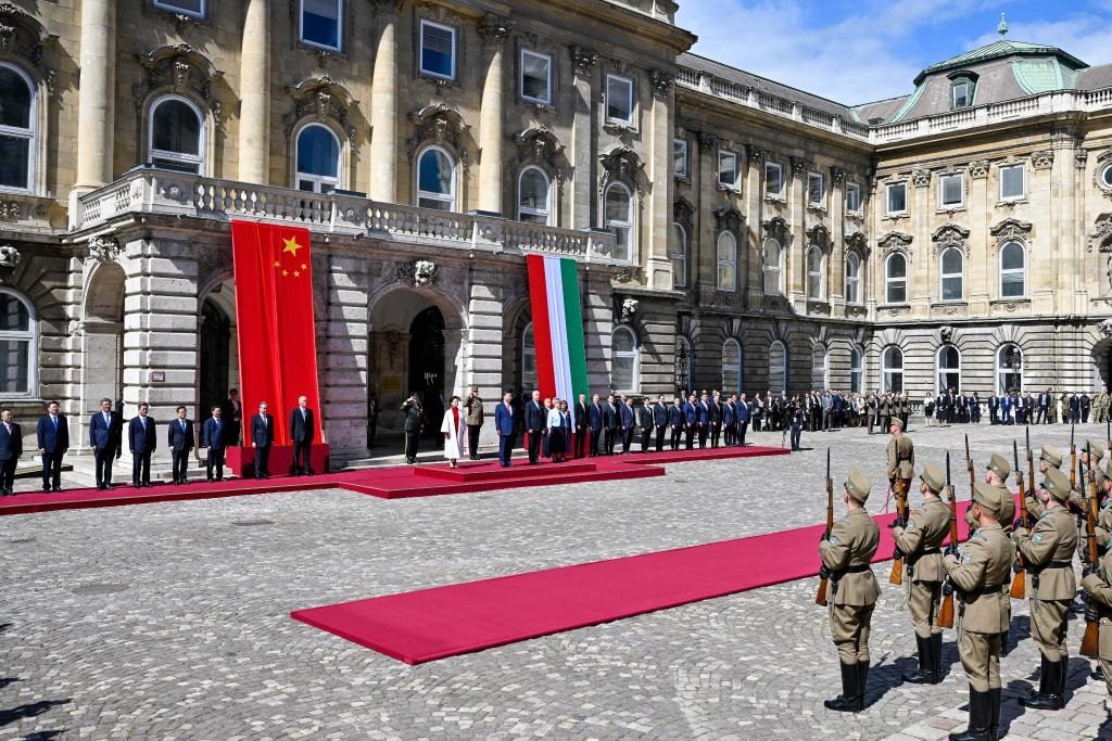 初夏時節(jié)的布達佩斯陽光明媚,古老宏偉的布達王宮莊嚴矗立,中匈兩國國旗相映成輝。習近平和夫人彭麗媛乘坐的國賓車隊在匈牙利禮賓馬隊護衛(wèi)下緩緩駛入布達王宮內庭。舒尤克總統(tǒng)夫婦和歐爾班總理夫婦熱情迎接。
