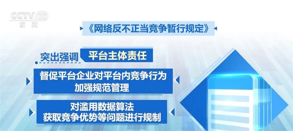 平臺(tái)企業(yè)掌握海量數(shù)據(jù),連接大量主體,既是網(wǎng)絡(luò)不正當(dāng)競爭監(jiān)管的重點(diǎn)對象,也是協(xié)同監(jiān)管的關(guān)鍵節(jié)點(diǎn)。《規(guī)定》突出強(qiáng)調(diào)了平臺(tái)主體責(zé)任,督促平臺(tái)企業(yè)對平臺(tái)內(nèi)競爭行為加強(qiáng)規(guī)范管理,同時(shí)對濫用數(shù)據(jù)算法獲取競爭優(yōu)勢等問題進(jìn)行規(guī)制。