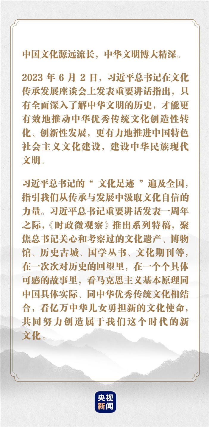 “這段時(shí)間,我一直在思考推進(jìn)中國(guó)特色社會(huì)主義文化建設(shè)、建設(shè)中華民族現(xiàn)代文明這個(gè)重大問(wèn)題。”2023年6月2日,在文化傳承發(fā)展座談會(huì)上,習(xí)近平總書(shū)記指出,“只有全面深入了解中華文明的歷史,才能更有效地推動(dòng)中華優(yōu)秀傳統(tǒng)文化創(chuàng)造性轉(zhuǎn)化、創(chuàng)新性發(fā)展,更有力地推進(jìn)中國(guó)特色社會(huì)主義文化建設(shè),建設(shè)中華民族現(xiàn)代文明?!?/p>