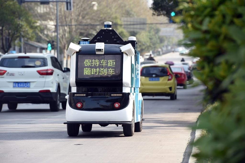 資料圖片:2022年3月15日,一輛無(wú)人配送車(chē)在合肥高新區(qū)進(jìn)行公開(kāi)道路測(cè)試。新華社記者 周牧 攝