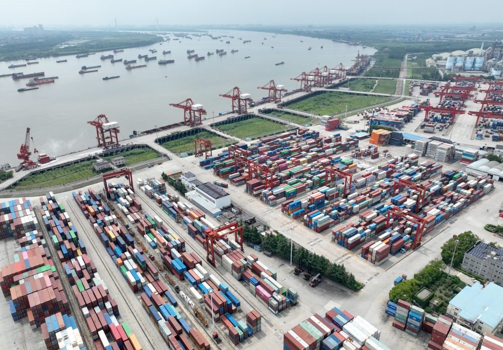 2024年6月1日拍攝的湖北武漢陽邏港(無人機照片)。2013年時,陽邏港僅有兩條集裝箱航線,船型小、班期少;如今,陽邏港已開通各類集裝箱航線20余條,實現(xiàn)“航運向東入海、班列向西入歐”。