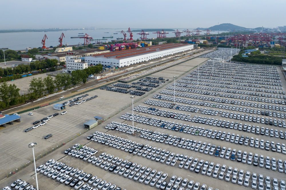 2024年5月26日,在安徽蕪湖港朱家橋港區(qū)國際集裝箱碼頭,整齊排列的汽車等待出口(無人機照片)。作為安徽省首個國家一類開放口岸,蕪湖港現(xiàn)已發(fā)展成為長三角城市群綜合交通運輸體系的重要樞紐。