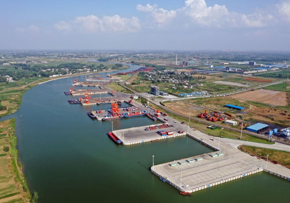 2022年6月28日拍攝的河南周口中心港碼頭(無人機照片)。近年來,河南積極推進沙潁河航道升級改造,疏通內(nèi)河航運?,F(xiàn)在,從周口中心港出發(fā)的船舶可經(jīng)沙潁河至淮河、京杭大運河駛?cè)腴L江,讓內(nèi)陸城市亦能通江達海。