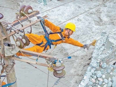 在四川省綿陽市平武縣,國網綿陽供電公司黨員突擊隊隊員在搶修輸電線路,他的身下就是滔滔洪水。田 海攝(人民視覺)