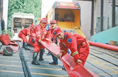 在安徽省合肥市瑤海區(qū),中國安能一局合肥救援基地排澇一組開展城市內澇排險作業(yè)。劉溫馨 申屠建華攝影報道