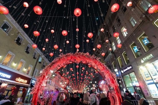 這是2月9日在俄羅斯首都莫斯科拍攝的掛滿中國新年主題裝飾的街道。當日,“莫斯科的中國新年”文化活動在俄羅斯首都莫斯科市中心啟動。新華社記者 白雪騏 攝