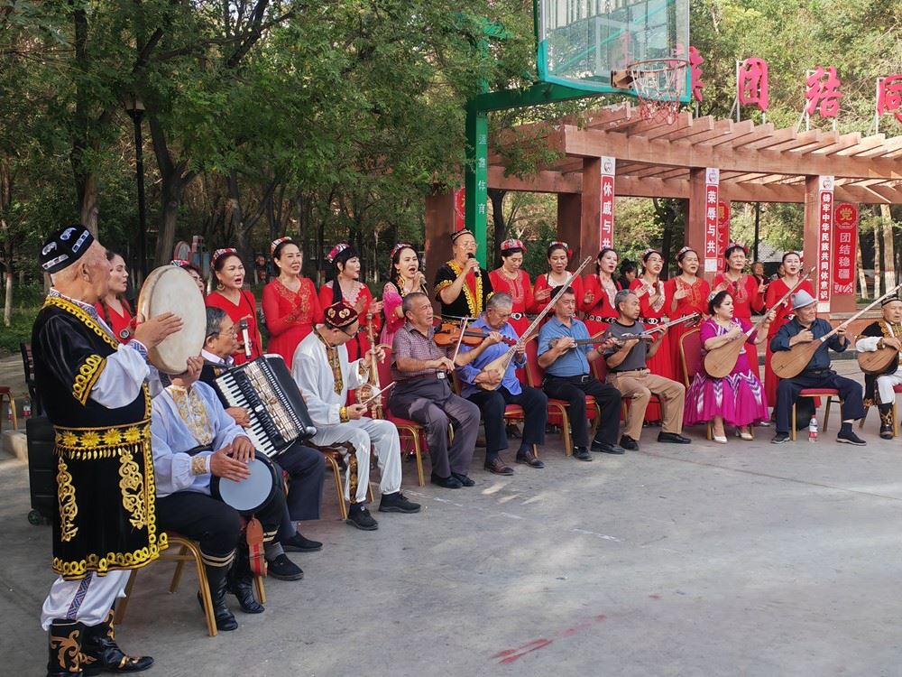 2024年9月19日,新疆庫(kù)爾勒市朝陽街道團(tuán)結(jié)社區(qū)石榴籽樂團(tuán)在為居民們表演。新華社記者 顧煜 攝