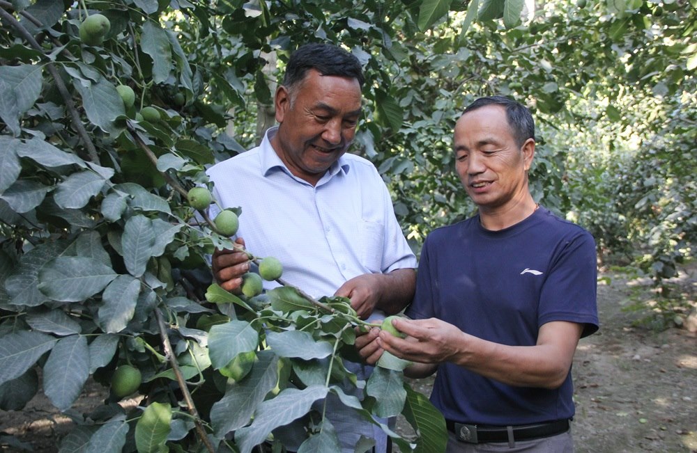 2023年8月29日,在新疆溫宿縣柯柯牙鎮(zhèn),果農(nóng)趙武中(右)、木合旦·吐爾迪在他們經(jīng)營(yíng)的核桃園里查看核桃生長(zhǎng)情況。新華社記者 李響攝