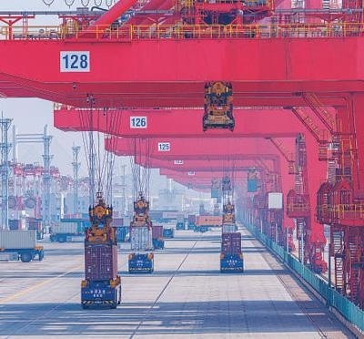軟聯(lián)通共建“一帶一路”國(guó)家在工作制度對(duì)接、技術(shù)標(biāo)準(zhǔn)協(xié)調(diào)、檢驗(yàn)結(jié)果互認(rèn)等方面強(qiáng)化合作、統(tǒng)一標(biāo)準(zhǔn),貿(mào)易自由化便利化水平不斷提升。上海洋山港海關(guān)對(duì)接共建國(guó)家進(jìn)出口貨物相關(guān)標(biāo)準(zhǔn),推動(dòng)通關(guān)一體化方式申報(bào),提升通關(guān)效率。圖為無(wú)人駕駛的全自動(dòng)導(dǎo)引車在洋山港穿梭往來(lái),搬運(yùn)集裝箱。王 初攝(影像中國(guó))