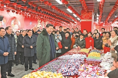 沈陽(yáng)大東副食品商場(chǎng)歷史悠久,富有特色的年節(jié)商品琳瑯滿目。23日上午,習(xí)近平來(lái)到這里,察看多家店鋪,頻頻同店主和顧客交流,詳細(xì)了解節(jié)日期間市場(chǎng)供應(yīng)情況。大家見(jiàn)到總書記都十分激動(dòng),連聲歡呼“總書記好”!習(xí)近平對(duì)大家說(shuō),“菜籃子”、“米袋子”、“果盤子”是民生大事,現(xiàn)在物質(zhì)豐裕,過(guò)年團(tuán)圓更要讓大家吃得好、吃得健康。