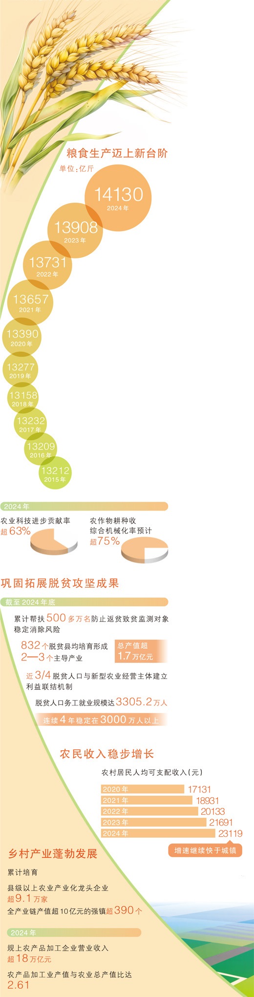 2024年,我國(guó)糧食產(chǎn)量首次超過(guò)1.4萬(wàn)億斤,邁上歷史性新臺(tái)階。食用植物油自給率進(jìn)一步提高,綠色優(yōu)質(zhì)農(nóng)產(chǎn)品供給持續(xù)增加。