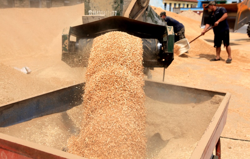 6月13日,河南省焦作市溫縣一家糧庫(kù)職工往倉(cāng)庫(kù)儲(chǔ)運(yùn)夏糧。