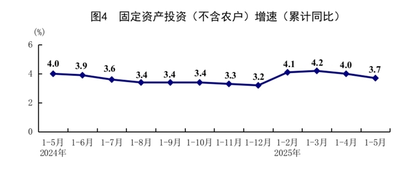 1—5月份,全國固定資產(chǎn)投資(不含農(nóng)戶)191947億元,同比增長3.7%;扣除房地產(chǎn)開發(fā)投資,全國固定資產(chǎn)投資增長7.7%。分領(lǐng)域看,基礎(chǔ)設(shè)施投資同比增長5.6%,制造業(yè)投資增長8.5%,房地產(chǎn)開發(fā)投資下降10.7%。全國新建商品房銷售面積35315萬平方米,同比下降2.9%;新建商品房銷售額34091億元,下降3.8%。分產(chǎn)業(yè)看,第一產(chǎn)業(yè)投資同比增長8.4%,第二產(chǎn)業(yè)投資增長11.4%,第三產(chǎn)業(yè)投資下降0.4%。民間投資同比持平;扣除房地產(chǎn)開發(fā)投資,民間投資增長5.8%。高技術(shù)產(chǎn)業(yè)中,信息服務(wù)業(yè),航空、航天器及設(shè)備制造業(yè),計算機及辦公設(shè)備制造業(yè),專業(yè)技術(shù)服務(wù)業(yè)投資同比分別增長41.4%、24.2%、21.7%、11.9%。5月份,固定資產(chǎn)投資(不含農(nóng)戶)環(huán)比增長0.05%。