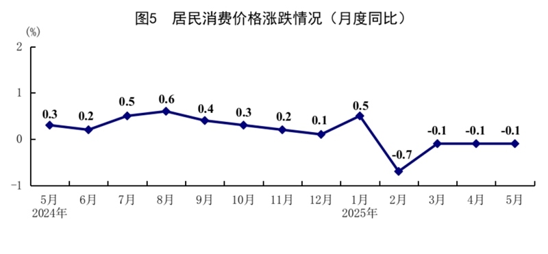 5月份,全國居民消費價格(CPI)同比下降0.1%,環(huán)比下降0.2%。分類別看,食品煙酒價格同比上漲0.1%,衣著價格上漲1.5%,居住價格上漲0.1%,生活用品及服務(wù)價格上漲0.1%,交通通信價格下降4.3%,教育文化娛樂價格上漲0.9%,醫(yī)療保健價格上漲0.3%,其他用品及服務(wù)價格上漲7.3%。在食品煙酒價格中,鮮菜價格下降8.3%,糧食價格下降1.4%,豬肉價格上漲3.1%,鮮果價格上漲5.5%??鄢称泛湍茉磧r格后的核心CPI同比上漲0.6%,漲幅比上月擴大0.1個百分點。1—5月份,全國居民消費價格同比下降0.1%。