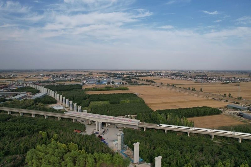 轉(zhuǎn)體前的雄忻高鐵雄保段跨京廣高鐵轉(zhuǎn)體橋(6月17日攝,無(wú)人機(jī)照片)。