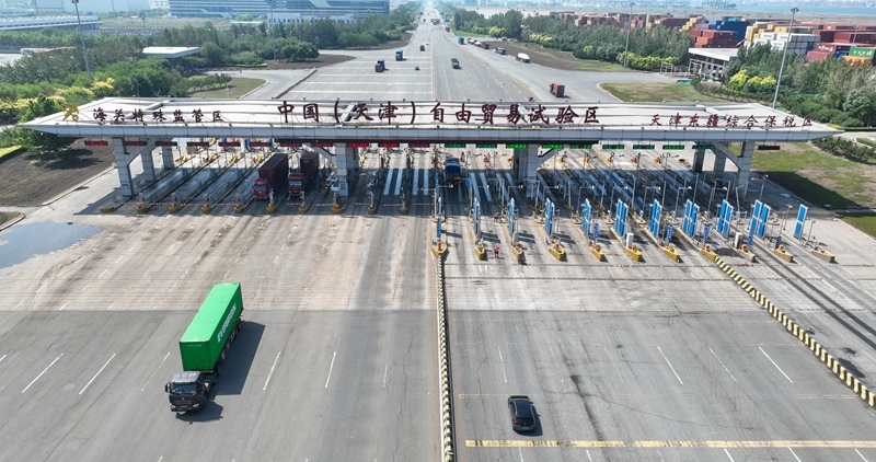這是6月20日拍攝的天津自貿區(qū)天津港東疆片區(qū)入口處的中國(天津)自由貿易試驗區(qū)海關特殊監(jiān)管區(qū)入口(無人機照片)。