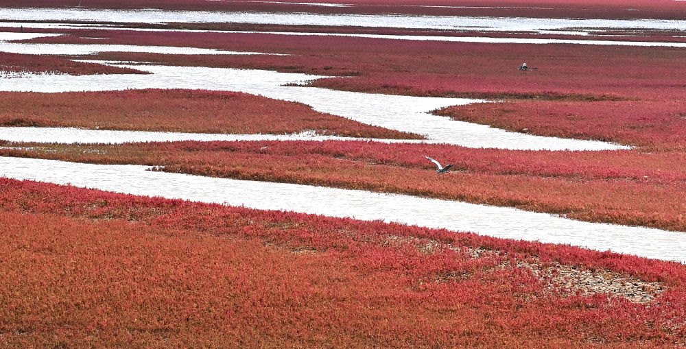 盤錦遼河口潮間帶,堿蓬草向陽(yáng)生長(zhǎng)。堿蓬草不僅能固碳,還能抵御海浪侵蝕。盤錦市自然資源局副局長(zhǎng)孫磊蹲在灘邊說(shuō):“堿蓬草對(duì)生態(tài)環(huán)境很敏感,以前自然岸線破壞、海水鹽度變化曾使堿蓬草大量減少,如今,大片堿蓬草到秋天就會(huì)變紅,這是生態(tài)向好的最佳信號(hào)?!?/p>