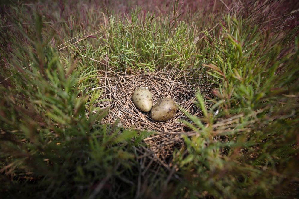 在遼河口國(guó)家級(jí)自然保護(hù)區(qū)南小河保護(hù)站附近的濕地,黑嘴鷗巢中有待孵化的蛋(2022年6月17日攝)。新華社記者 潘昱龍 攝