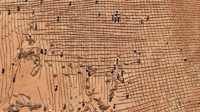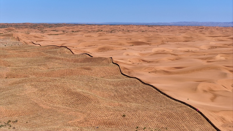 6月30日,在位于寧夏中衛(wèi)市長流水村的騰格里沙漠東南緣,隨著治沙工人將最后一列草方格穩(wěn)穩(wěn)扎下,這項跨越半個世紀的治沙工程,在騰格里沙漠寧夏境內(nèi)實現(xiàn)全面“鎖定”。一條長153公里、最寬處達38公里的固沙鎖邊帶蜿蜒開來。