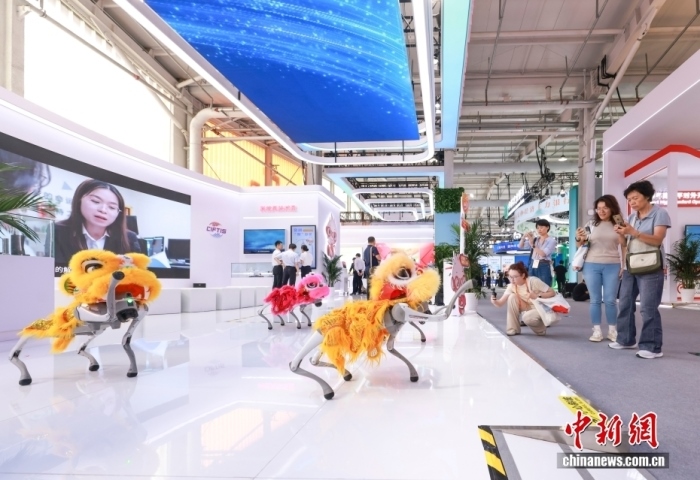 9月10日,2025年中國國際服務(wù)貿(mào)易交易會在北京首鋼園開幕。圖為觀眾參觀機(jī)器狗群舞表演。中新社記者 賈天勇 攝