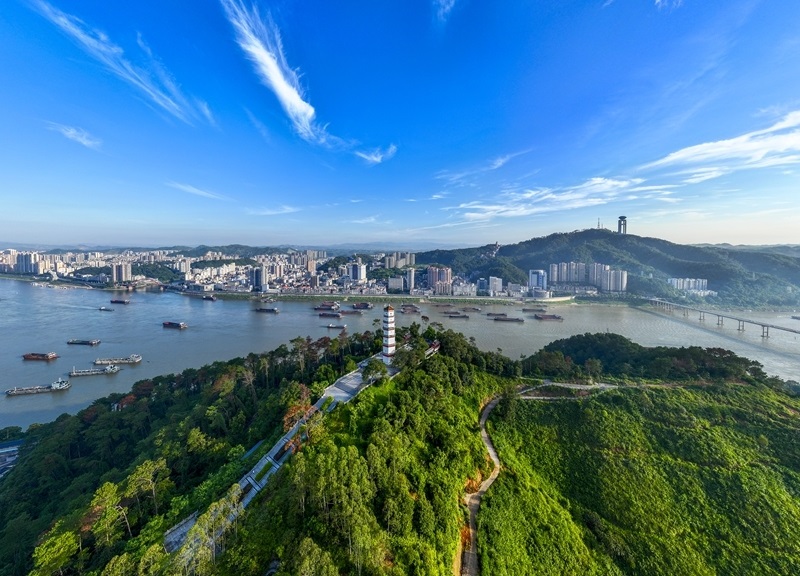 8月30日,在廣西梧州市萬秀區(qū)的西江航道上,船只在秋日晴空下往來穿梭(無人機照片)。