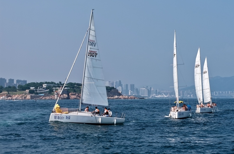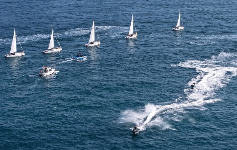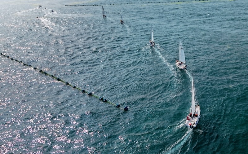青島小麥島附近海域,市民和游客乘坐帆船參加海上巡游活動(7月10日攝,無人機照片)。