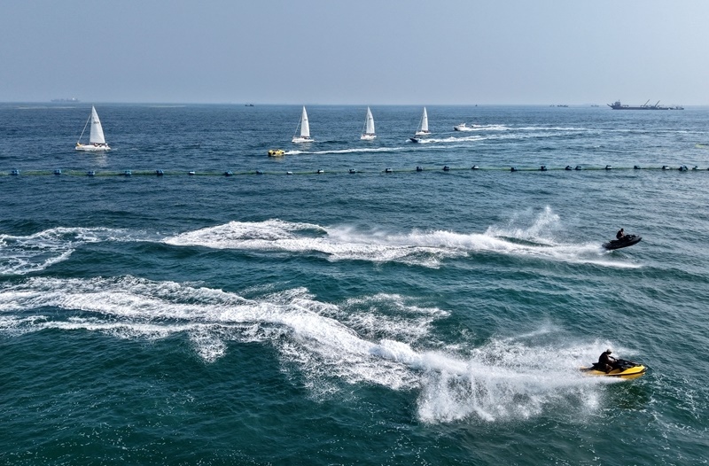 青島老龍灣海域,摩托艇參加海上巡游活動(7月10日攝,無人機照片)。