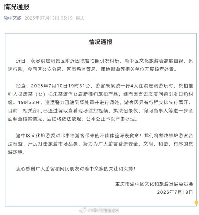 對上述事件,13日重慶渝中區(qū)文旅委致歉,相關(guān)部門已通過調(diào)取查看現(xiàn)場監(jiān)控視頻、執(zhí)法記錄儀,詢問當(dāng)事人等進(jìn)一步全面調(diào)查核實(shí)情況,后續(xù)將依法依規(guī)、公平公正予以嚴(yán)肅處理。