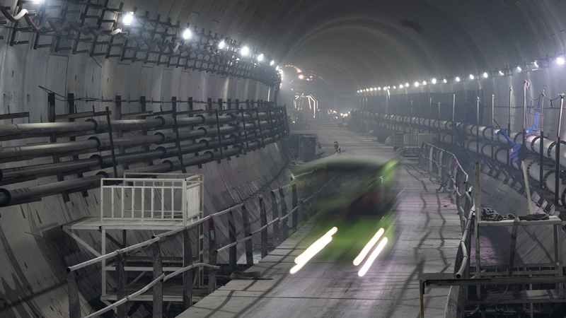 7月16日,工程車(chē)輛行駛在貫通的隧道內(nèi)。