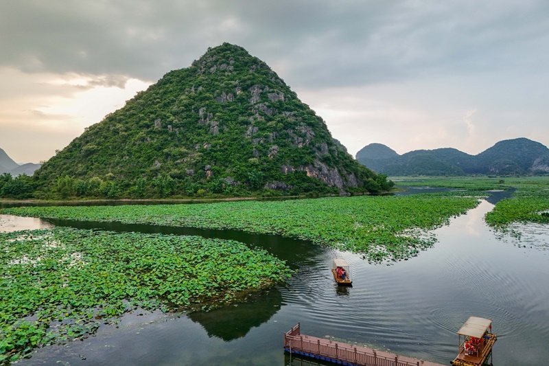 盛夏時(shí)節(jié),云南省文山壯族苗族自治州丘北縣普者黑景區(qū)內(nèi)萬(wàn)畝荷花初綻,碧葉連天,與獨(dú)特的喀斯特峰林、清澈湖泊繪就一幅獨(dú)具特色的山水畫卷,吸引八方游客紛至沓來(lái)。