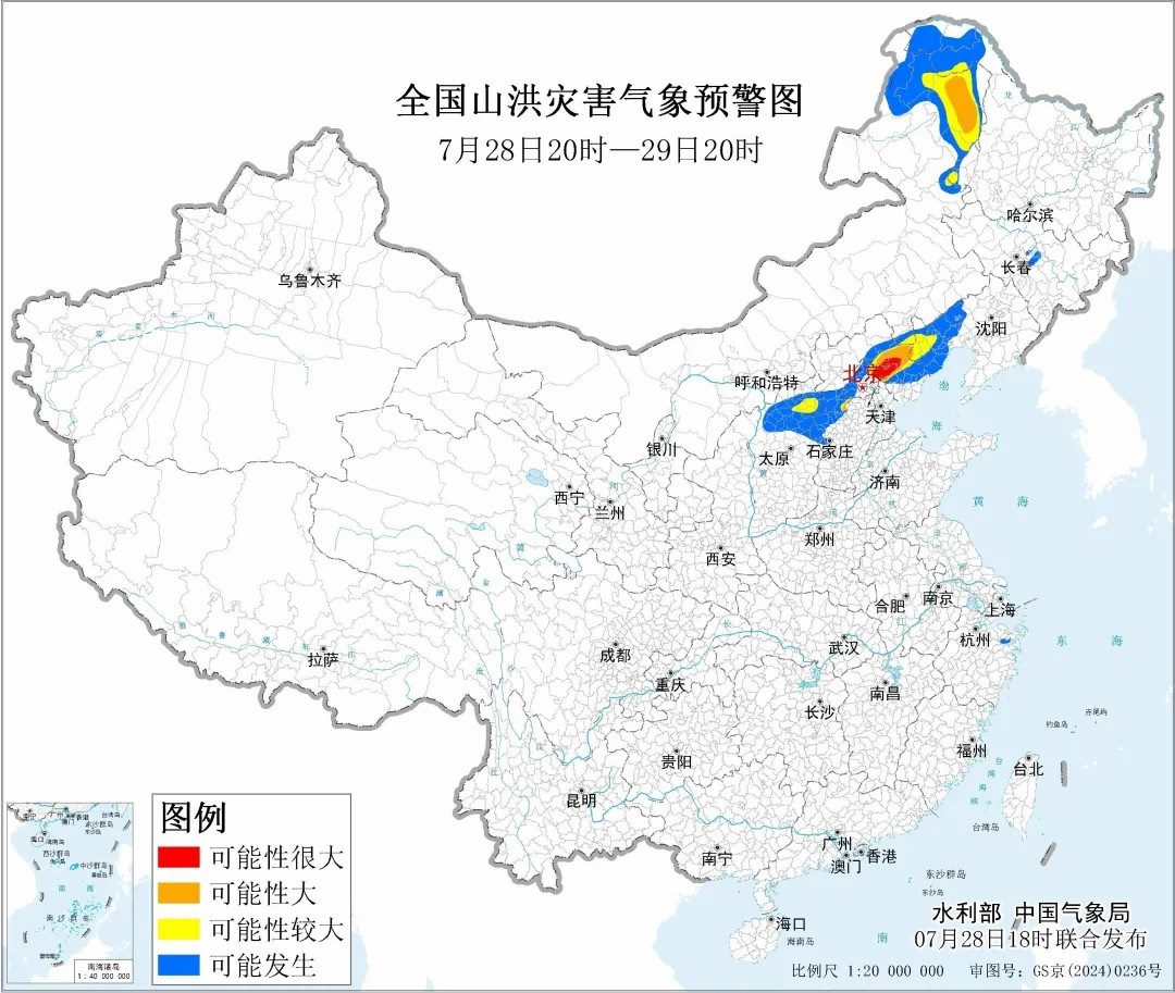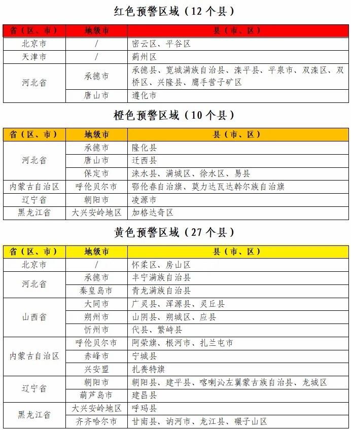 據(jù)“中國水利”微信公眾號消息,水利部和中國氣象局7月28日18時聯(lián)合發(fā)布紅色山洪災(zāi)害氣象預(yù)警:預(yù)計(jì),7月28日20時至7月29日20時,北京東部、天津北部、河北中部和東北部、內(nèi)蒙古東北部、遼寧西部、黑龍江西部等地部分地區(qū)發(fā)生山洪災(zāi)害可能性大(橙色預(yù)警),其中,北京東部、天津北部、河北東北部局地發(fā)生山洪災(zāi)害可能性很大(紅色預(yù)警),預(yù)警區(qū)域涉及的縣(市、區(qū))見下表。其他地區(qū)也可能因局地短歷時強(qiáng)降水引發(fā)山洪災(zāi)害,請各地注意做好實(shí)時監(jiān)測、防汛預(yù)警和轉(zhuǎn)移避險等防范工作。