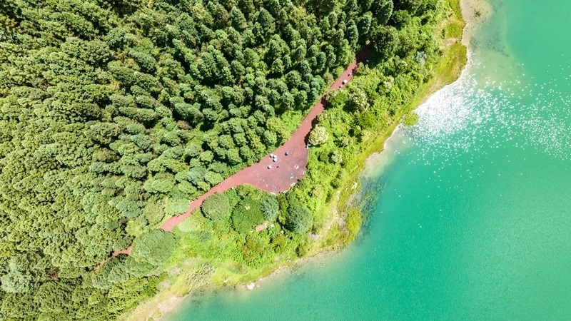 7月30日,游客在瑤池公園棧道上漫步(無(wú)人機(jī)照片)。