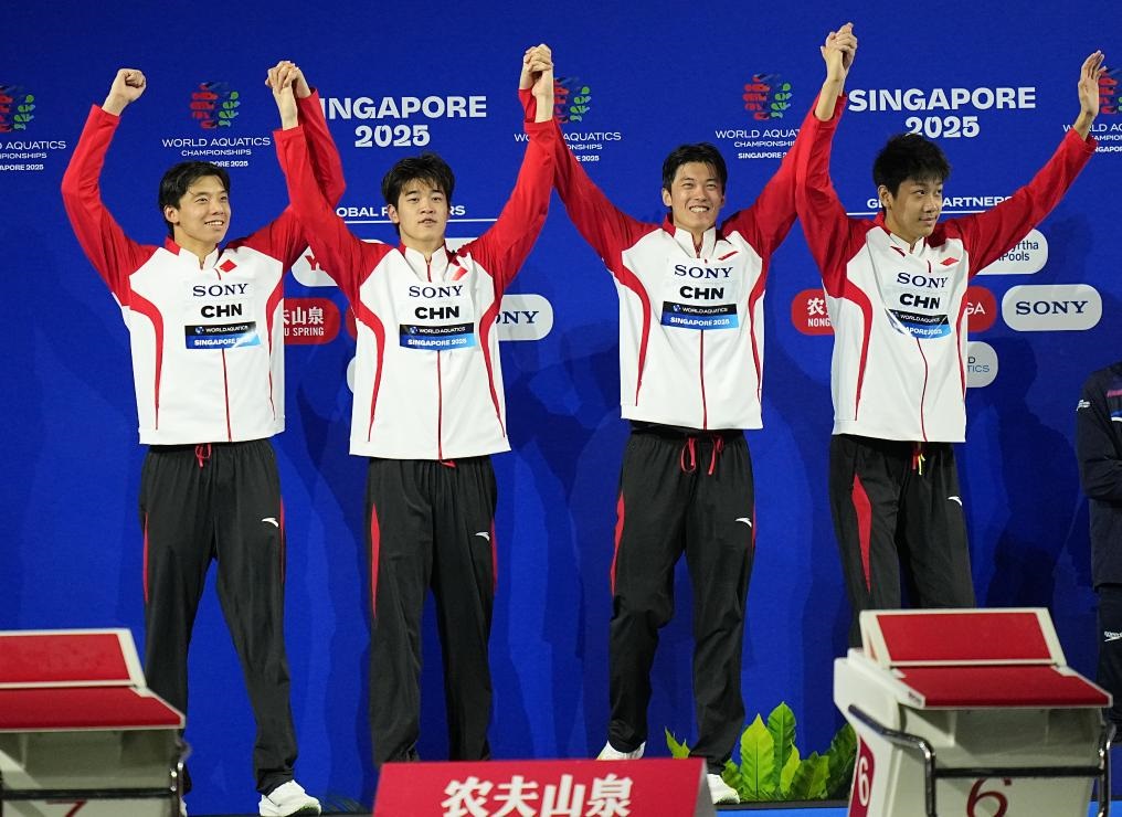 8月1日,由季新杰、潘展樂、汪順、張展碩(從左至右)組成的中國(guó)隊(duì)在頒獎(jiǎng)儀式上。新華社記者 夏一方 攝
