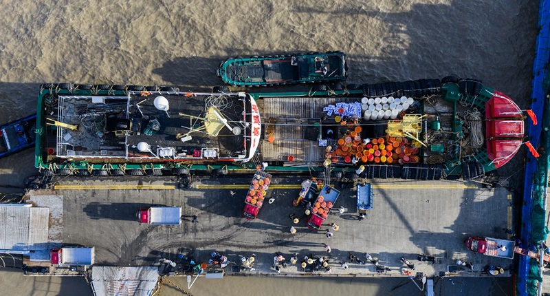 近日,東海部分海域結(jié)束為期3個月的伏季休漁期,浙江舟山市申請了專項(xiàng)捕撈特許的漁船結(jié)束休漁,開赴東海海域進(jìn)行捕撈作業(yè)。漁運(yùn)船和漁船一同抵達(dá)作業(yè)漁場,捕撈上來的海產(chǎn)品由漁運(yùn)船先行送回港口碼頭,漁船則留在海上繼續(xù)生產(chǎn)。