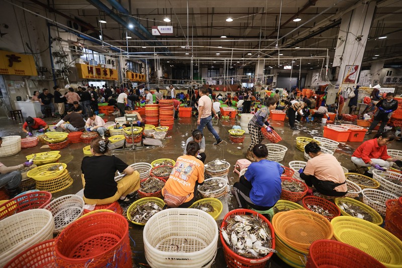 8月12日,商家在舟山沈家門舟山國際水產(chǎn)城內(nèi)分揀、綁扎當(dāng)天到港的梭子蟹。