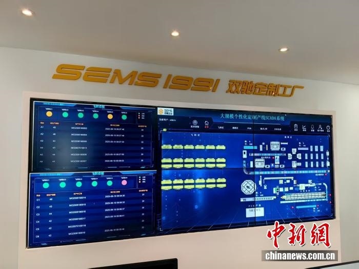 雙馳定制工廠大規(guī)模個性化定制產(chǎn)線SCADA系統(tǒng)。中新網(wǎng)記者 閆旭 攝