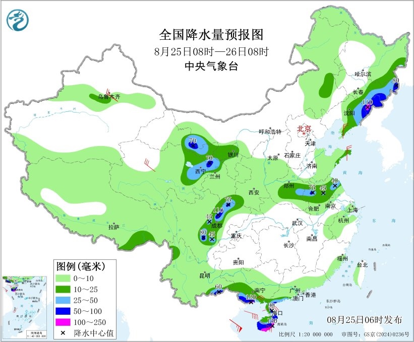 8月25日8時(shí)至26日8時(shí),青海東部、甘肅中部、黑龍江東南部、吉林東部、遼寧東部、河南東部、蘇皖中北部、四川盆地西部和北部、云南東南部、廣西南部、廣東西南部沿海、海南島大部等地部分地區(qū)有大到暴雨,其中,吉林東南部、四川盆地西北部、廣西南部沿海、海南島南部等地部分地區(qū)有大暴雨(100~130毫米)。新疆沿天山地區(qū)、遼東半島、山東半島、廣西東南部沿海、廣東西南部沿海、海南島等地的部分地區(qū)有4~7級(jí)風(fēng)。