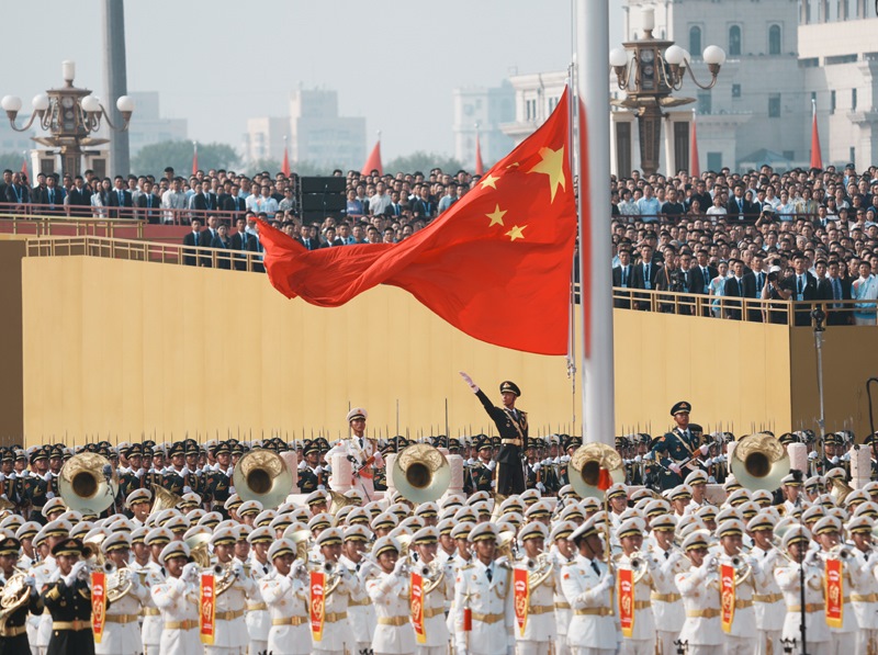 9月3日,紀(jì)念中國人民抗日戰(zhàn)爭(zhēng)暨世界反法西斯戰(zhàn)爭(zhēng)勝利80周年大會(huì)在北京隆重舉行。這是天安門廣場(chǎng)舉行隆重的升國旗儀式。