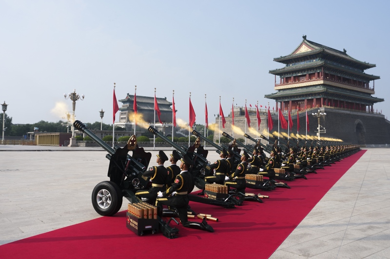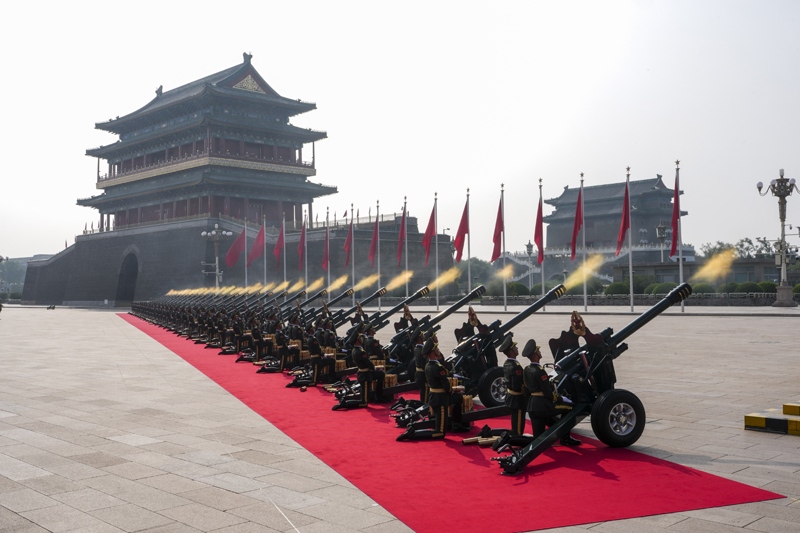9月3日,紀(jì)念中國(guó)人民抗日戰(zhàn)爭(zhēng)暨世界反法西斯戰(zhàn)爭(zhēng)勝利80周年大會(huì)在北京隆重舉行。這是禮炮在天安門廣場(chǎng)鳴響。