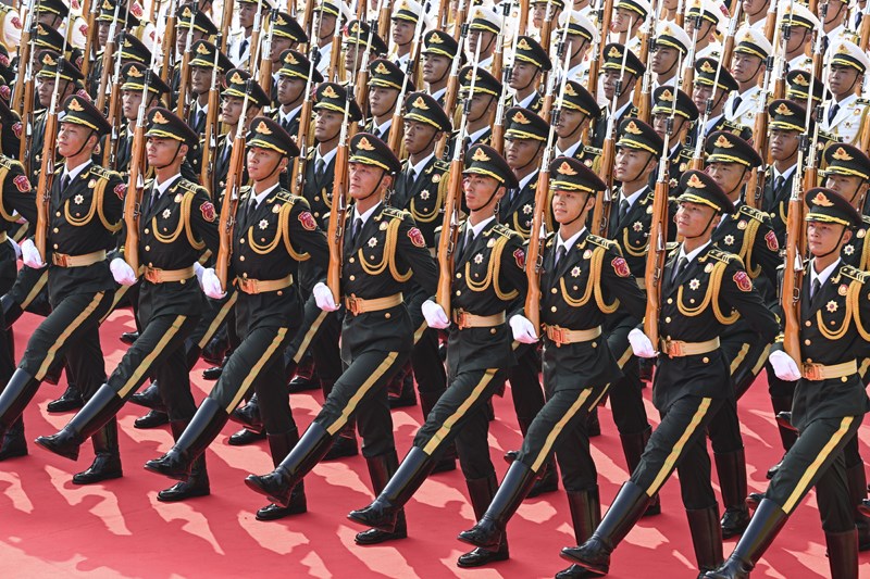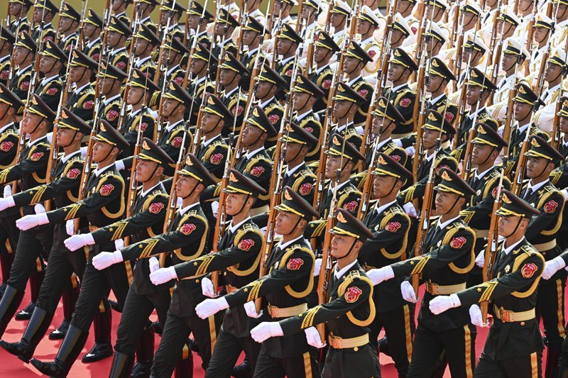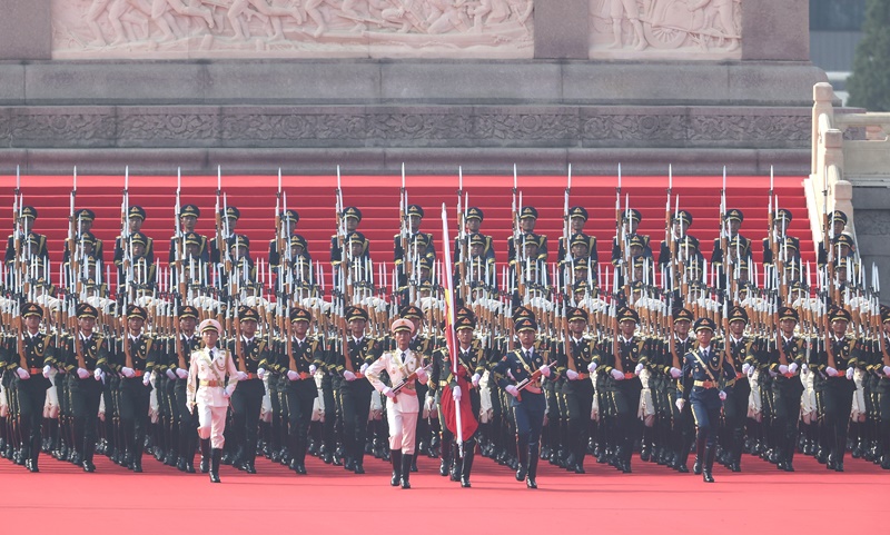 9月3日,紀(jì)念中國(guó)人民抗日戰(zhàn)爭(zhēng)暨世界反法西斯戰(zhàn)爭(zhēng)勝利80周年大會(huì)在北京隆重舉行。這是國(guó)旗護(hù)衛(wèi)隊(duì)在行進(jìn)中。