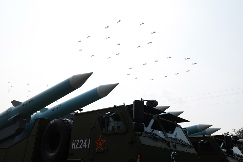 9月3日,紀(jì)念中國人民抗日戰(zhàn)爭(zhēng)暨世界反法西斯戰(zhàn)爭(zhēng)勝利80周年大會(huì)在北京隆重舉行。這是空中護(hù)旗梯隊(duì)從反艦導(dǎo)彈方隊(duì)上空飛過。