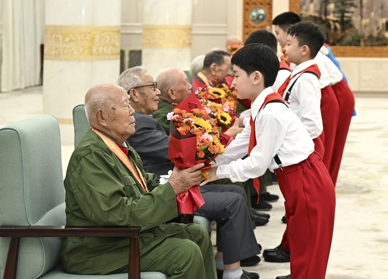 9月3日晚,紀(jì)念中國(guó)人民抗日戰(zhàn)爭(zhēng)暨世界反法西斯戰(zhàn)爭(zhēng)勝利80周年文藝晚會(huì)《正義必勝》在北京人民大會(huì)堂隆重舉行。這是晚會(huì)開始前,少先隊(duì)員向前來(lái)觀看演出的抗戰(zhàn)老戰(zhàn)士老同志代表獻(xiàn)花。