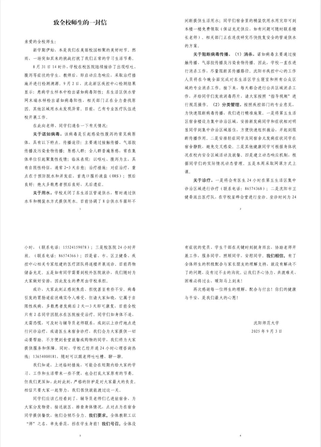 9月3日,沈陽師范大學(xué)發(fā)布的《致全校師生的一封信》(以下簡稱“《一封信》”)中稱,8月31日14時許,學(xué)校在校醫(yī)院陸續(xù)接診了出現(xiàn)嘔吐、腹瀉等癥狀的學(xué)生、教師。相關(guān)部門正在全力查找原因,目前已有專業(yè)醫(yī)療隊伍進(jìn)校開展工作。