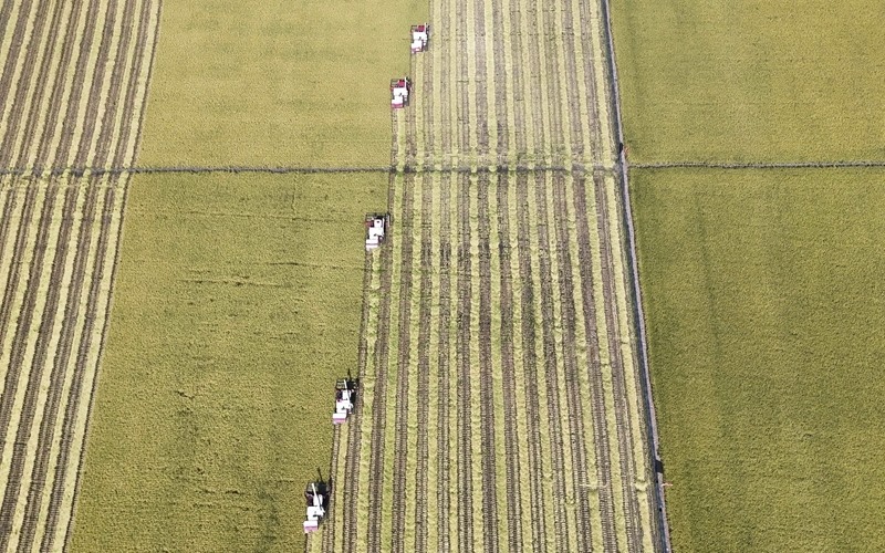 9月5日,在北大荒集團(tuán)黑龍江江川農(nóng)場有限公司水稻種植基地,農(nóng)機(jī)手操作農(nóng)機(jī)收割水稻(無人機(jī)照片)。
