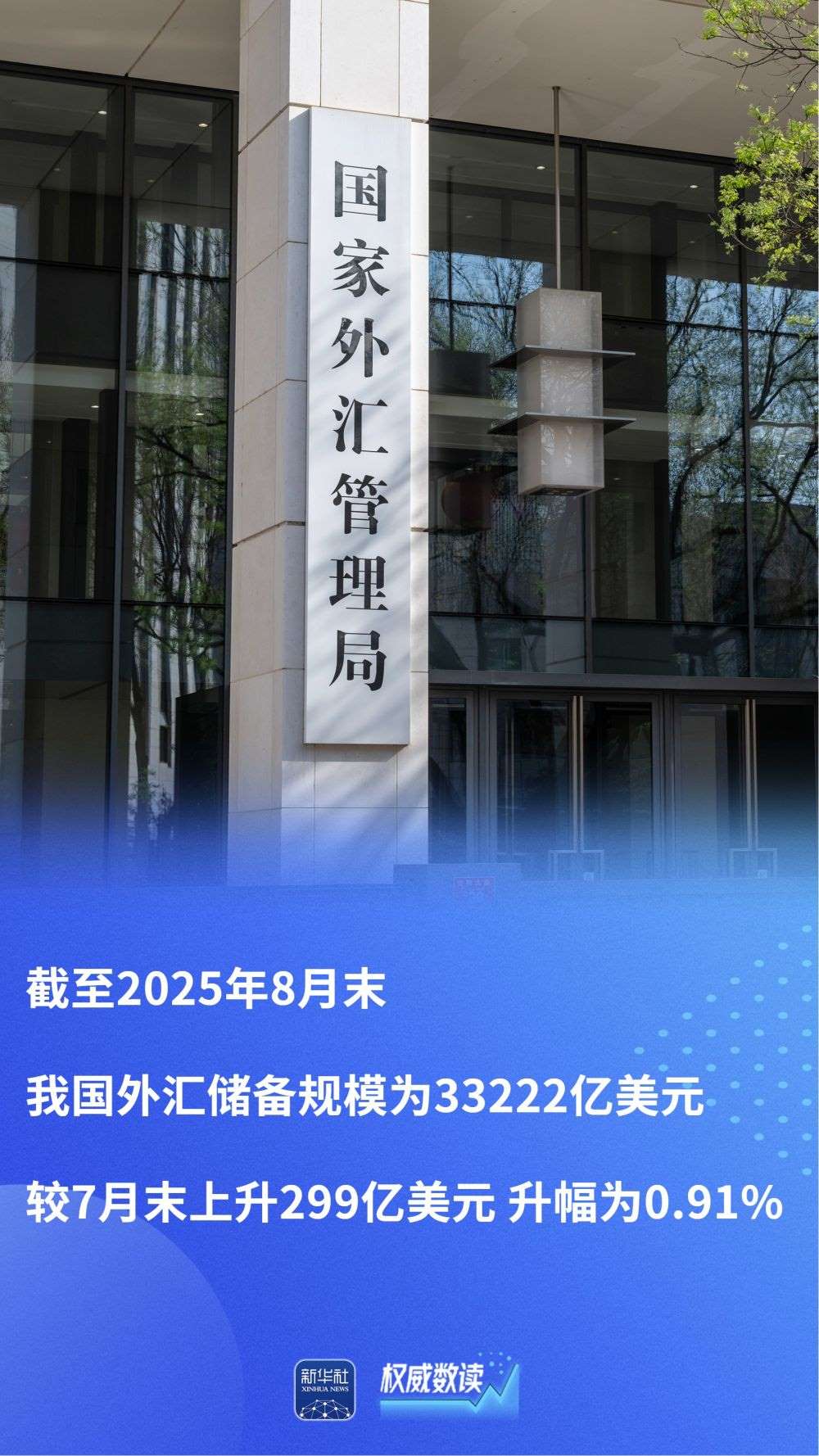 國家外匯管理局?jǐn)?shù)據(jù)顯示,截至2025年8月末,我國外匯儲備規(guī)模為33222億美元,較7月末上升299億美元,升幅為0.91%。