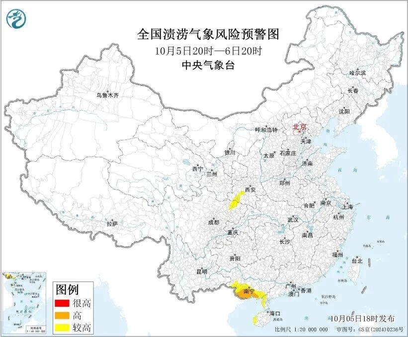 中央氣象臺10月5日18時發(fā)布漬澇風險氣象預報:受強降雨的影響,預計10月5日20時至6日20時,廣東西南部、廣西南部和西部、海南西部、四川東北部、陜西西部等地部分地區(qū)發(fā)生漬澇的氣象風險較高,其中,廣西南部等地部分地區(qū)發(fā)生漬澇的氣象風險高,易形成城市內澇和農(nóng)田漬害,需加強防范。